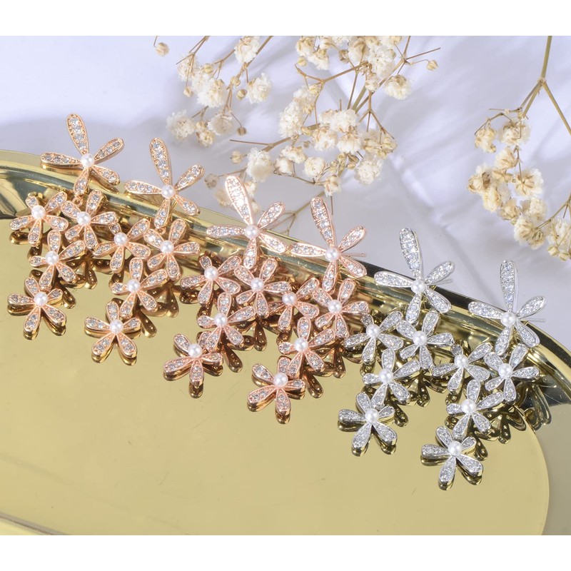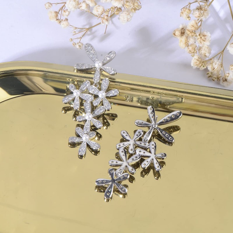- GORGEOUS DESIGN - Sparkly 5A cubic zirconia cz crystal stones and pearls, 14k white gold plated, these elegant cz cluster flower floral plant earrings are sure to catch everyone's eyes.