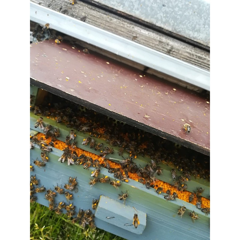 To secure part of the flower pollen for human consumption, the beekeeper attaches a pollen trap at the entrance of the hive.