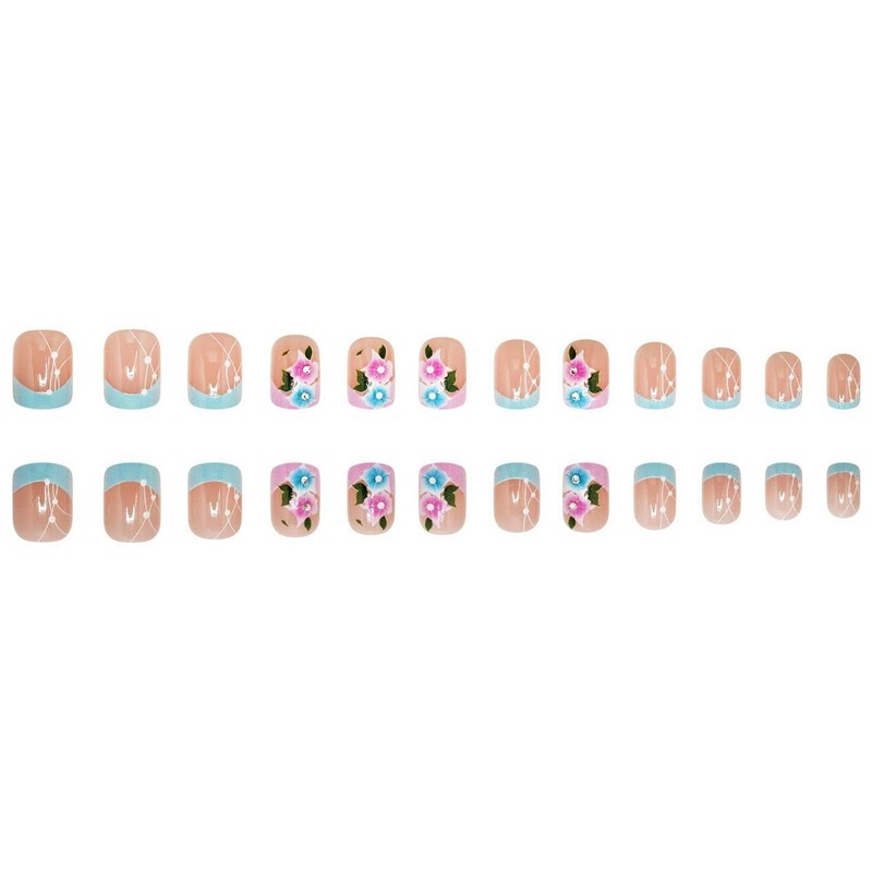 Flower Press on Nails Short Square OFDNE French Tip Fake Nails Blue Pink False Nails with Designs Rhinestones Floral Glossy Glue on Nails Spring Summer Acrylic Nails for Women Girls 24 Pcs