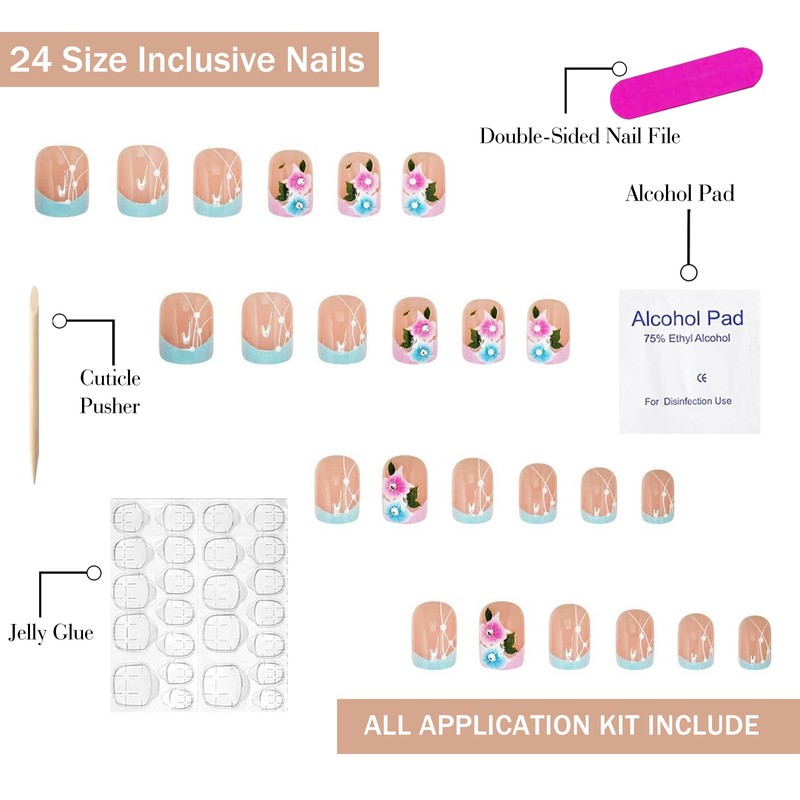 - Package Includes: 24 pieces short fake nails, 1 sheet of 24 pieces jelly glue, 1 piece of mini nail file, 1 piece of wooden stick and 1 piece alcohol pads.