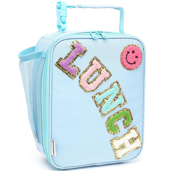 FlowFly Lunch box Insulated Soft Bag Mini Cooler Back to School Thermal Meal Tote Kit With Buckle and Mesh Side Pocket for Girls, Boys, BlueWithLetter
