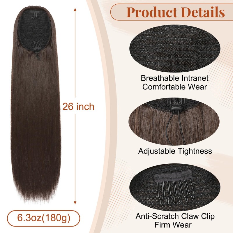 FLUFYMOOZ ponytail extension, 26 Inch Long Straight Drawstring Ponytail Synthetic Hairpieces Fake Pony Tails Natural Soft Clip in Hair Extension ponytail for Women (Dark Chocolate Brown)