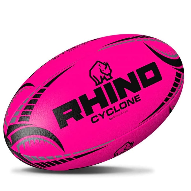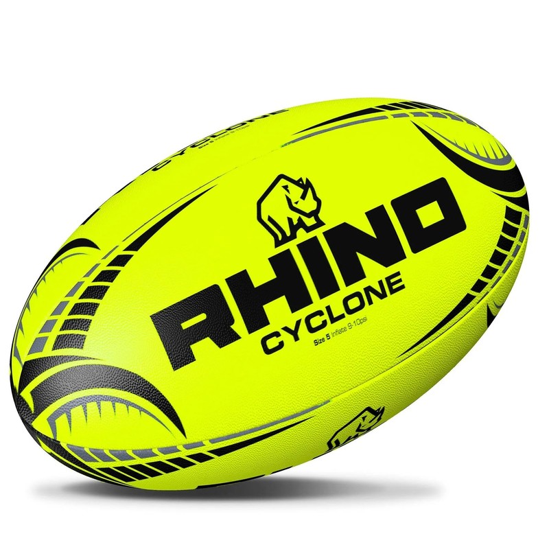 - Available in sizes 3 4 and 5|3D large grip pattern unique to Cyclone adds durability and longevity|Constructed from blend of natural and synthetic rubber|All Rhino Rugby balls are 100% hand stitched