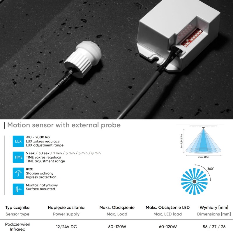 - Design: mini built-in motion sensor 12V-24V with twilight sensor.