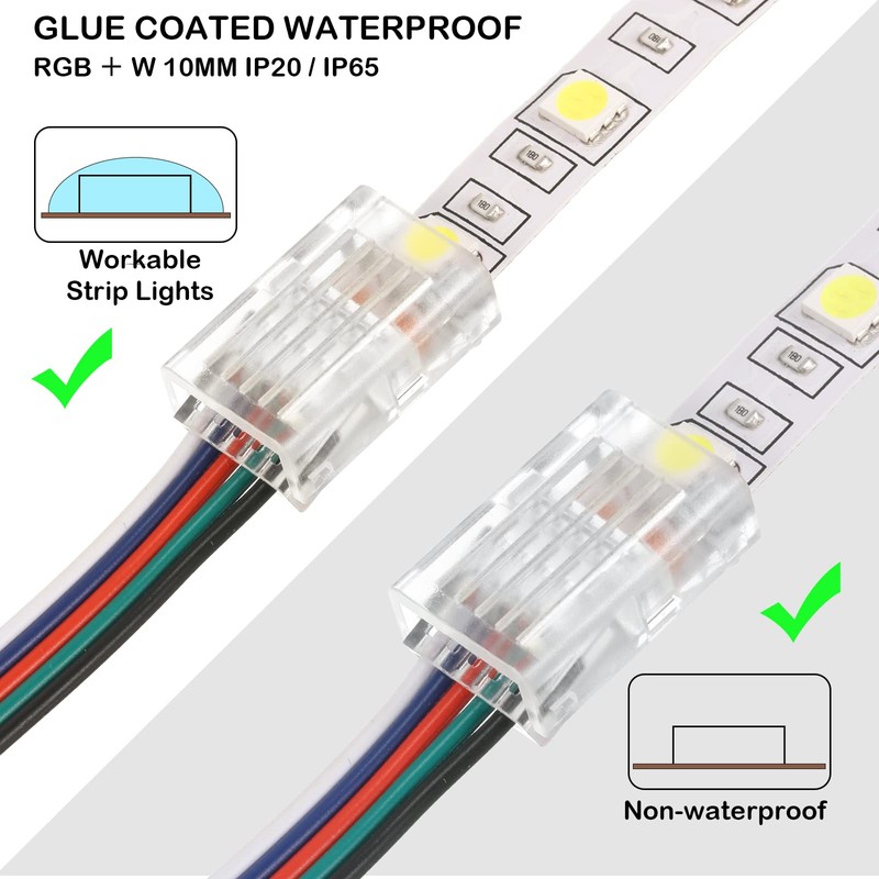 - Nice compatibility for most light strips: the LED strip light connectors can not only be compatible with 5V, 12V, 24V LED light strips, but also serve for 10 mm LED strip lights and 22 AWG 5 conductor wires, solid wires and multi core wires; Tips: not suitable for 8 mm LED strips, 3528 LED strip and 20 AWG wire