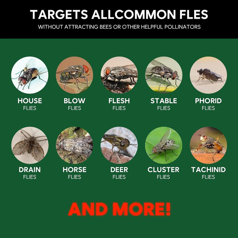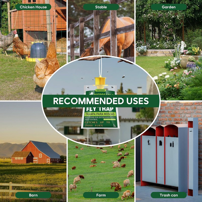 - 【Fly Traps Outdoor Hanging】 Outdoor hanging fly traps get rid of common nuisance or dirty flies, including hundreds of the most popular species! These fly bags are best used for outdoor spaces or in a well vented area including yards, chicken coops, horse stables, barns, ranches or farms. Each fly killer is 8.5 x 9.6 inches, and we are equipped with ropes to hang on branches or fences.