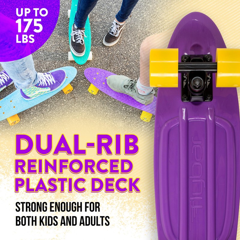 - Custom Flybar Non-Slip Deck: The 22” x 6” deck on our complete plastic skate boards are made of a strong, high impact injection molded plastic that will give you the flex and strength for smooth and quality ride.