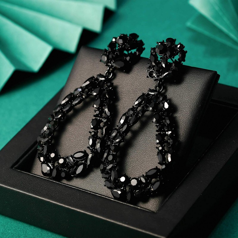 Flyonce Women's Crystal Open Hoop Oval Drop Statement Pierced Dangle Earrings Black Black-Tone