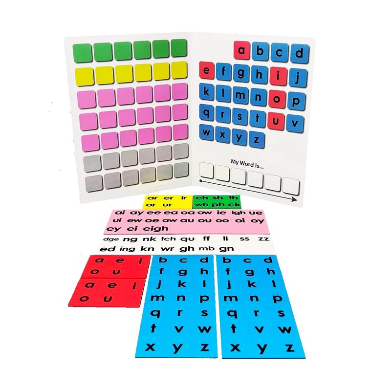 • Includes a convenient 12" x 18" full color magnetic board that folds compactly to 9" x 12" that provides ample space for magnetic manipulation and has space for additional word building activities on the back.