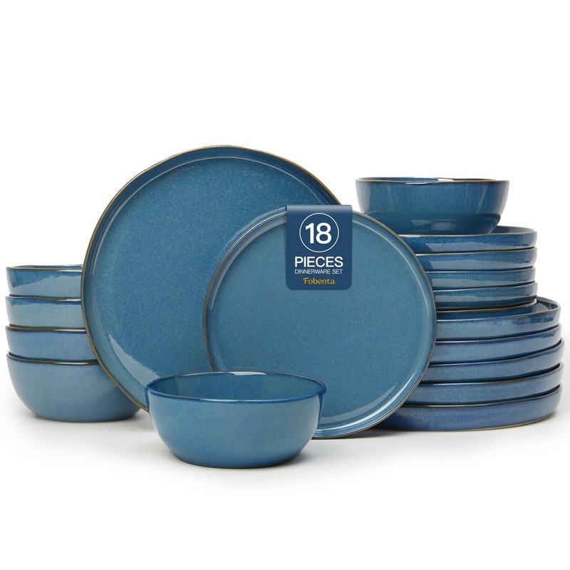 FOBENTA 18 Piece Slate Blue Ceramic Plates and Bowls Set,Minimalist Dinnerware Sets for 6 – Dark Dish Set with Sculpted Edge for Modern Living