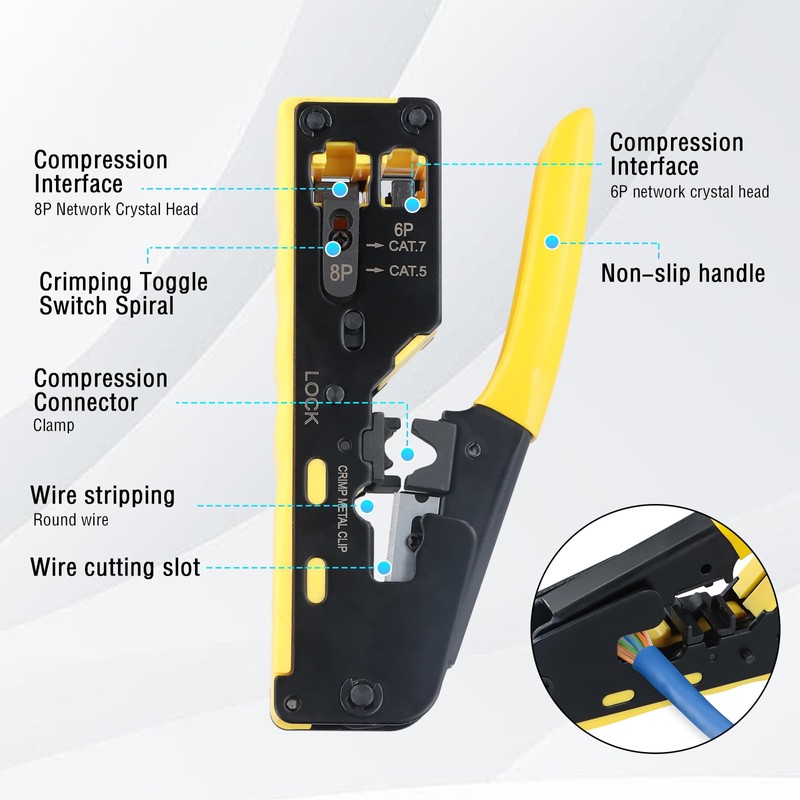 • 8P/6P DUAL USE CRIMPING TOOL Our crimping tool can be adapted to CAT5/6 and even CAT7 network connectors, making it a versatile addition to your toolkit.
