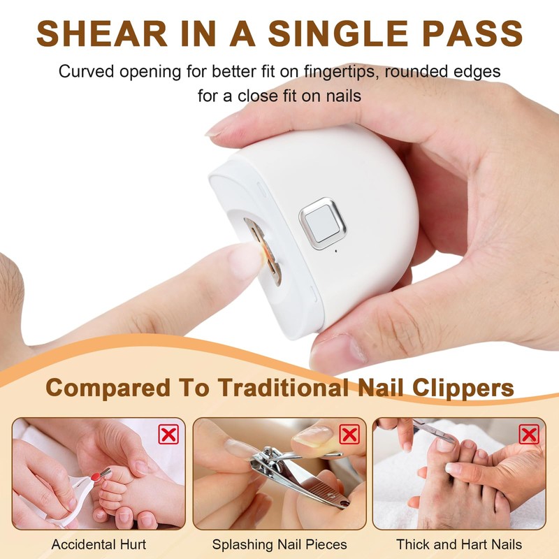 - ✅ 【Elektrischer Nagel-Clipper für Babys, Kinder und Senioren】 Dieser sichere und effiziente automatische Nagelschneider verfügt über eine spiralförmige versteckte Klinge und zwei Geschwindigkeitseinstellungen. Ideal für empfindliche Babynägel, Kinder, ältere Benutzer und empfindliche Haut-kein Risiko von Schnitten oder Übertrimmen.