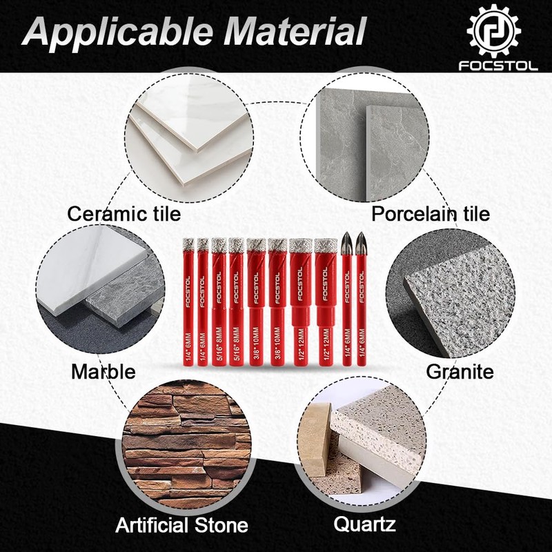 - Application 2-----Diamond Drill Bit Set is suitable for dry or wet drilling in Porcelain Ceramic Tile Marble Granite Artificial Stone Quartz, etc. Wet using will prolong the working life. Round shank design for stable clamping, smooth and easy drilling
