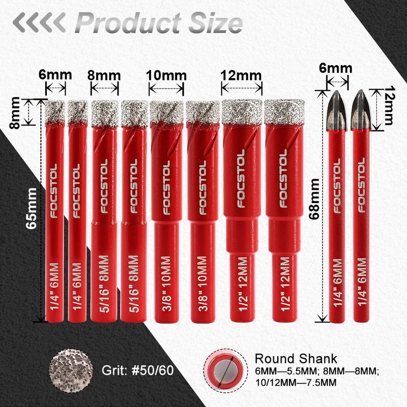 - Package Include 2-----Totally 10pcs/set: Diameter 8pcs 6/8/10/12mm drill bits+2pcs 6mm carbide drill; total length 65mm; diamond height 8mm; diamond grit #50/60; round shank