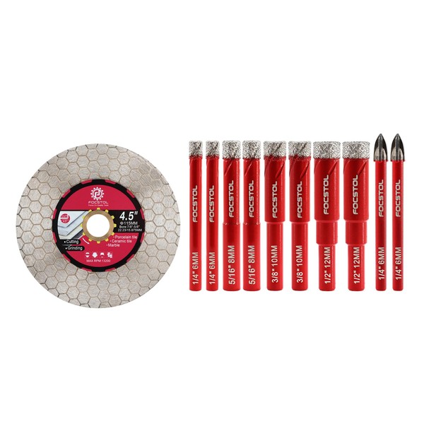 FOCSTOL Diamond Tile Saw Blade 4.5''(115mm) and Dry Diamond Drill Bit Set 10pcs