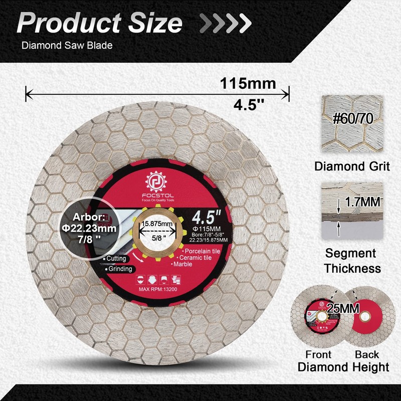 - Package Include 1-----1pc Diamond Tile Saw Blade, 4.5 Inch(115mm); bore 7/8 Inch(22.23mm), with a washer 7/8 Inch-5/8 Inch(22.23mm-15.875mm)