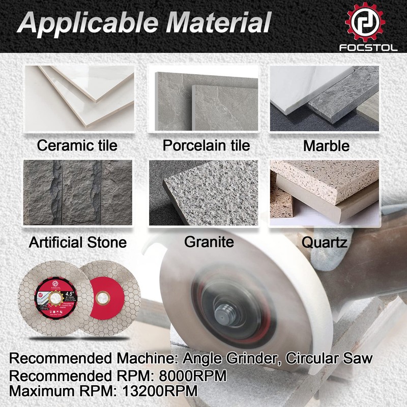 - Application 1-----Diamond Cutting Grinding Disc is suitable for dry or wet cutting of Porcelain Ceramic Tile Marble Granite Artificial Stone, etc