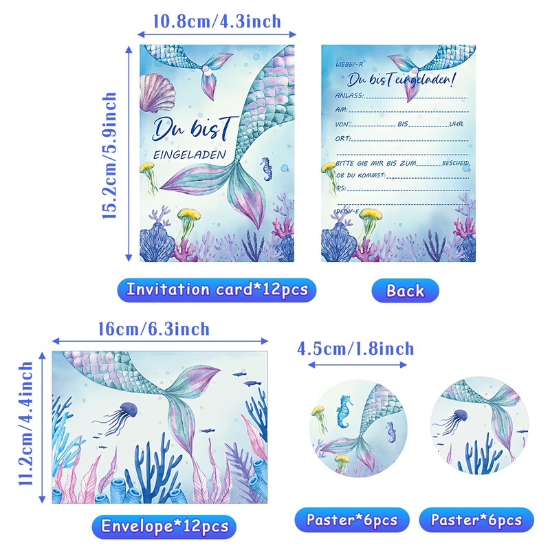 - Perfect set: This set contains 12 beautiful invitation cards with colourful mermaid motif, 12 envelopes and 12 stickers, perfect for your little princess surprise party and other party meetings.