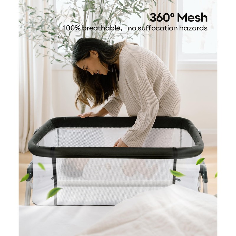 Fodoss Baby Bassinet Bedside Sleeper with Wheels and Storage Tray,4-Sided Mesh Bedside Bassinet for Infant/Newborn,7 Height Adjustable Easy Folding Bedside Crib