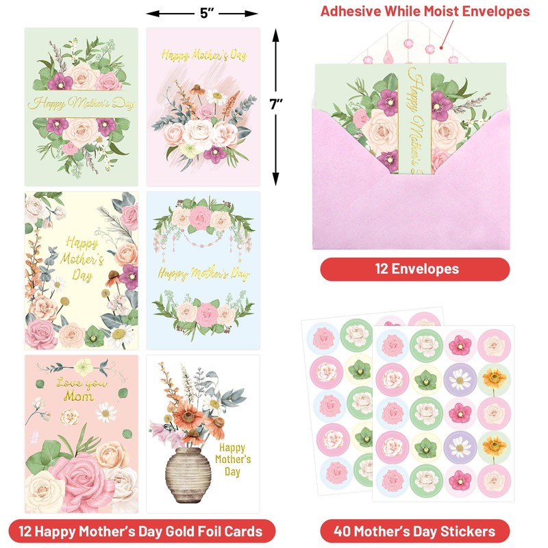 - Foil Mother's Day Cards with Envelopes 12PCS Boho Flower Cards