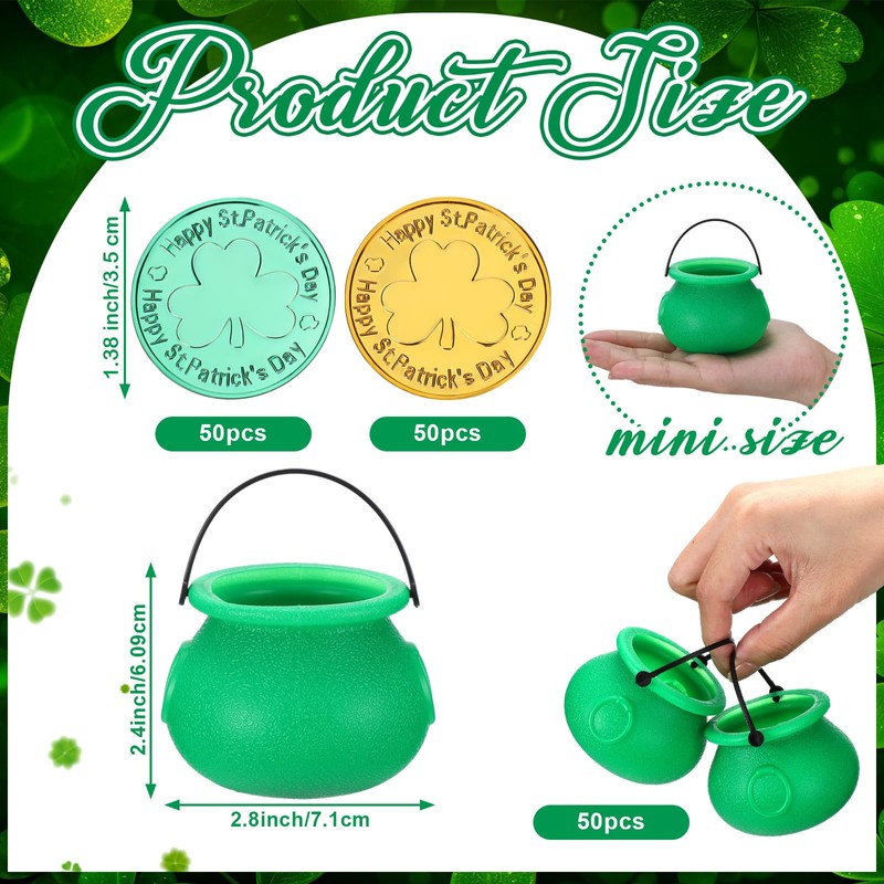 - Generous Package Inclusion: every purchase of the St. Patrick's Day small cauldron with shamrock coins set comes with an impressive bundle which includes 50 mini witch pots, 50 green clover coins, and 50 golden clover coins; This generous inclusion of items ensures you have a plentiful supply to create a St. Patrick's Day festive atmosphere
