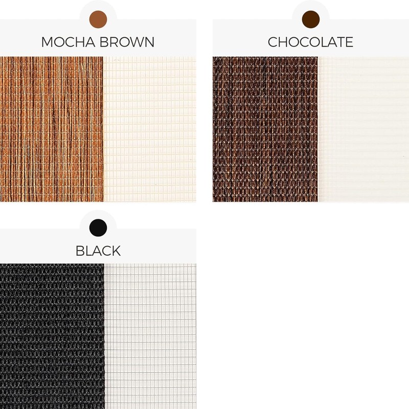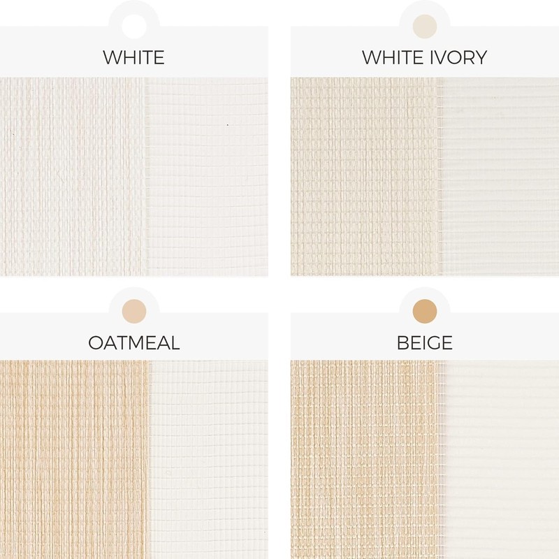 - FEATURES: 100% Polyester, Made of Fabric that looks like a wood surface. Sheer Mesh with Opaque Fabric slats in horizontal stripes. For color check and fabric quality, fabric sample can help you. It contains White/White Ivory/Oatmeal/Beige/Orange/Walnut/Dark Beige/Cherry Brown/Mocha Brown/Black. Other colors are in Woodlook 2.