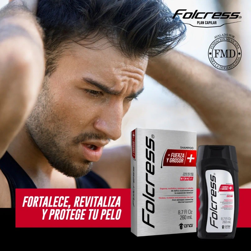 Invierte en el Shampoo Folcress Fuerza y Grosor para Hombre para una cabellera visiblemente más fuerte, densa y con la vitalidad que siempre has deseado.