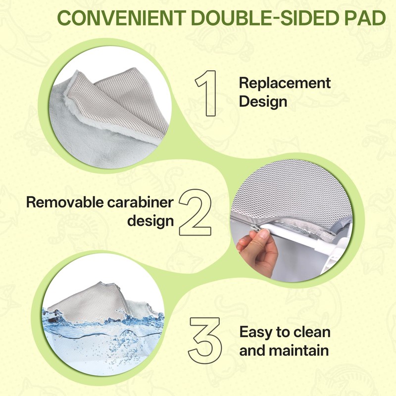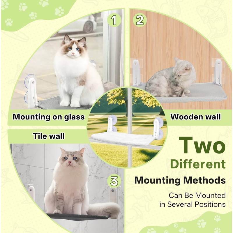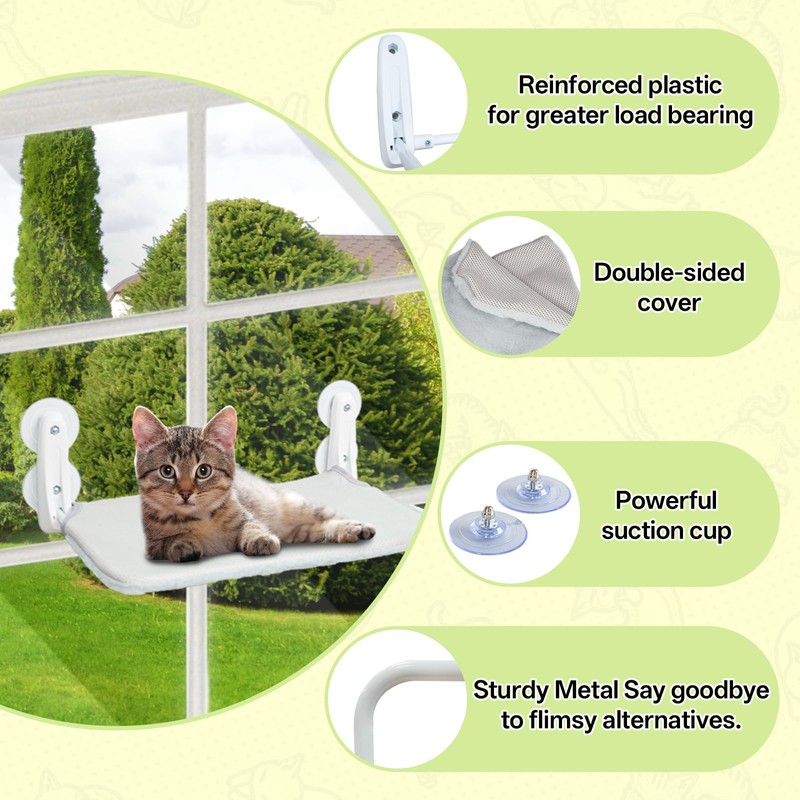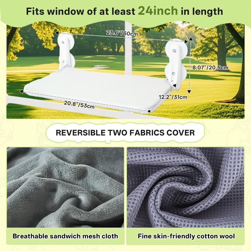 - Washable Dual-Sided Cover:Crafted with tight-fitting fabric and a secure zipper to prevent loosening when your cat jumps or stretches, the reversible cover is made for year-round comfort—breathable mesh for hot days, plush fleece for colder months. The removable cover is machine washable, keeping your cat window hammock fresh and clean with ease.