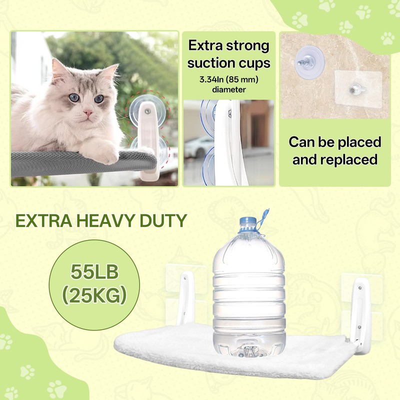 - Strong Suction Cups:Designed for effortless setup, this cat window perch mounts securely on glass or smooth wooden surfaces with 4 industrial-strength suction cups that support up to 55 lbs. Say goodbye to tools and tricky installations—just press and go. Ideal for indoor cats who love soaking up the sun in their favorite spot.