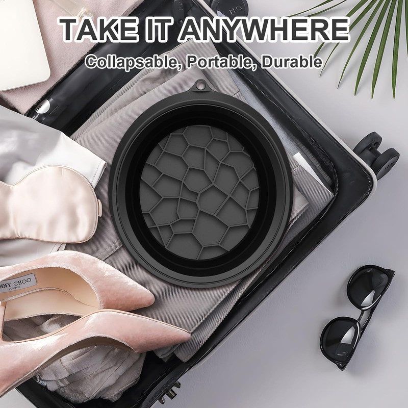- Space-Saving & Travel-Friendly - Collapsible design shrinks to 1inch thickness for bags, or bathroom storage. Hang it effortlessly with the side hole for drip-free drying—ideal for vacations, camping trips, or on-the-go skincare.