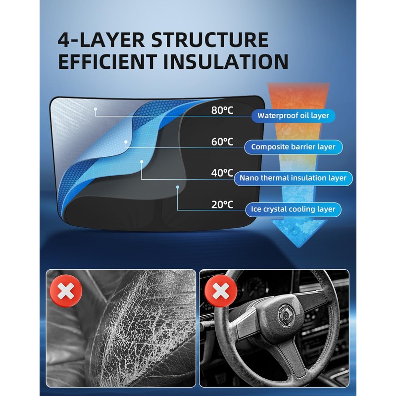 - 【4-Layer Thermal Insulation Structure】- Uses 4 layers of fabric against the sun, effectively blocks heat, reduces temperature in the car, insulates UV rays, prevents aging of vehicle interior parts