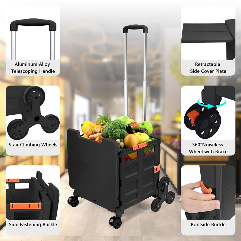 - [Smart and Simple]: The folding shopping cart with wheels is equipped with two Stair Climbing Wheels and two detachable 360°rotating noiseless wheels with brake buttons, which is easy to steer and slide when in use and prevent the cart from sliding when not in use, for higher safety. The wheels can be easily removed and replaced in a very simple way. Besides,the trolley has a cover to ensure the safety of items and will not get wet when it rains.