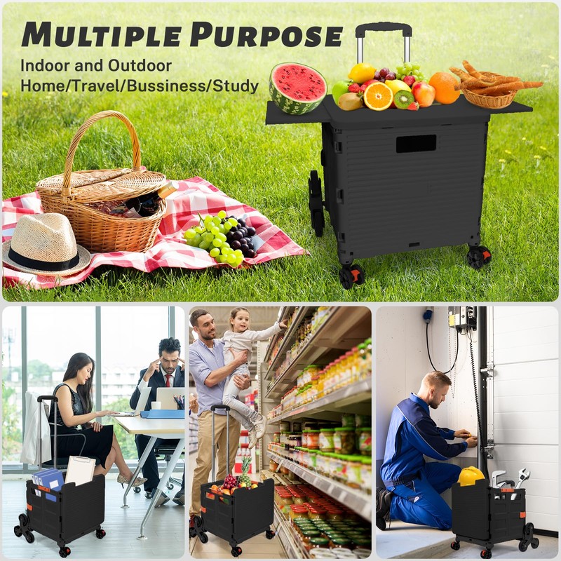 - [High Quality Material]: This shopping cart with wheels is made out of premier, sturdy, durable and environment friendly polypropylene, equipped with anti-rust aluminum alloy handle (stronger and lighter) and wear-resistant and pressure-resistant TPE rubber wheels to ensure smooth rolling when applicable. Besides, the material of the folding utility cart makes it easy to roll on any road and ensures longevity.