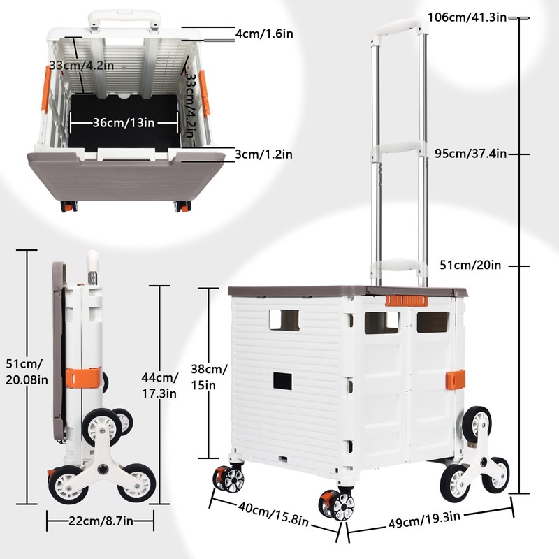 - [Smart and Simple]: The folding shopping cart with wheels is equipped with two Stair Climbing Wheels and two detachable 360°rotating noiseless wheels with brake buttons, which is easy to steer and slide when in use and prevent the cart from sliding when not in use, for higher safety. The wheels can be easily removed and replaced in a very simple way. Besides,the trolley has a cover to ensure the safety of items and will not get wet when it rains.