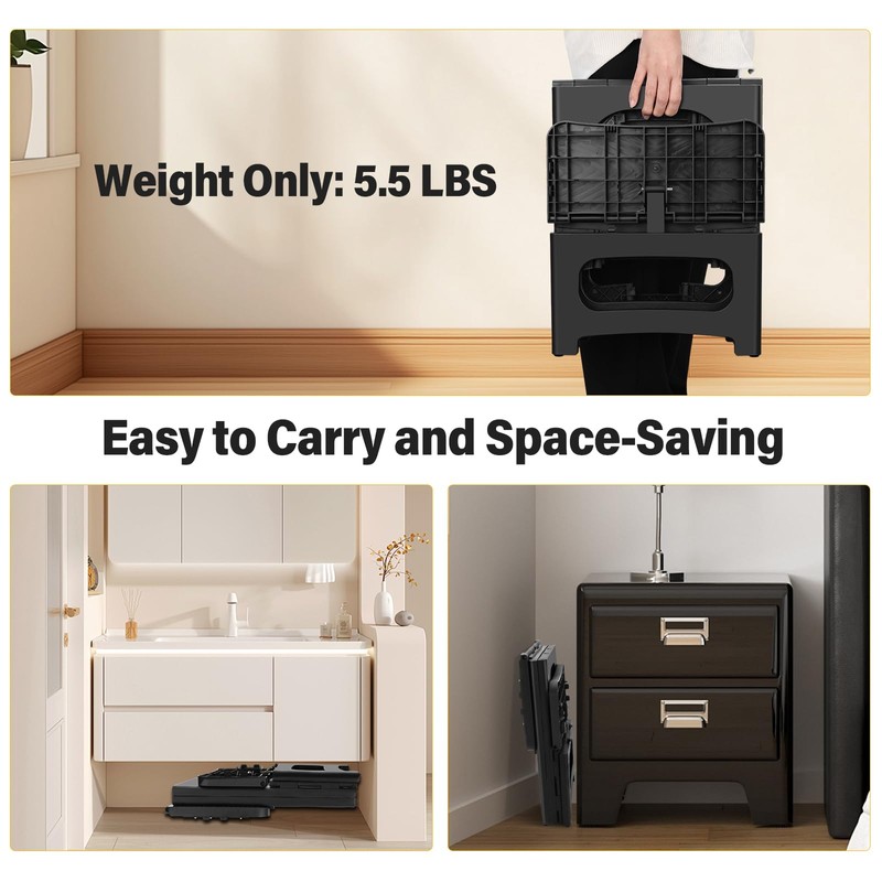 - Easy to Carry:Our Portable Step Stool weighs only 5.5 pounds and is only 1.5 inches thick when folded. It's easy to carry and suitable for indoor or outdoor use. When not in use, it saves space and can be stored flat or upright in closets, against walls, under beds, sofas, or in cars.