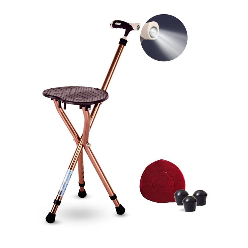 Folding Cane Seat Sturdy Lightweight Adjustable Handle Legs with LED Light Cushion for Elderly Walking Stick 300 lbs Large Plate