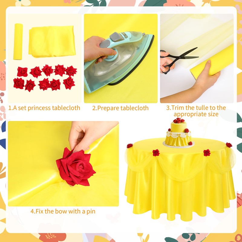 - Package Contents: our princess tulle tablecloth decoration set includes 1 yellow tablecloth, 10 red rose pins, 1 roll of yellow tulle, abundant quantity, you can combine and decorate according to your needs