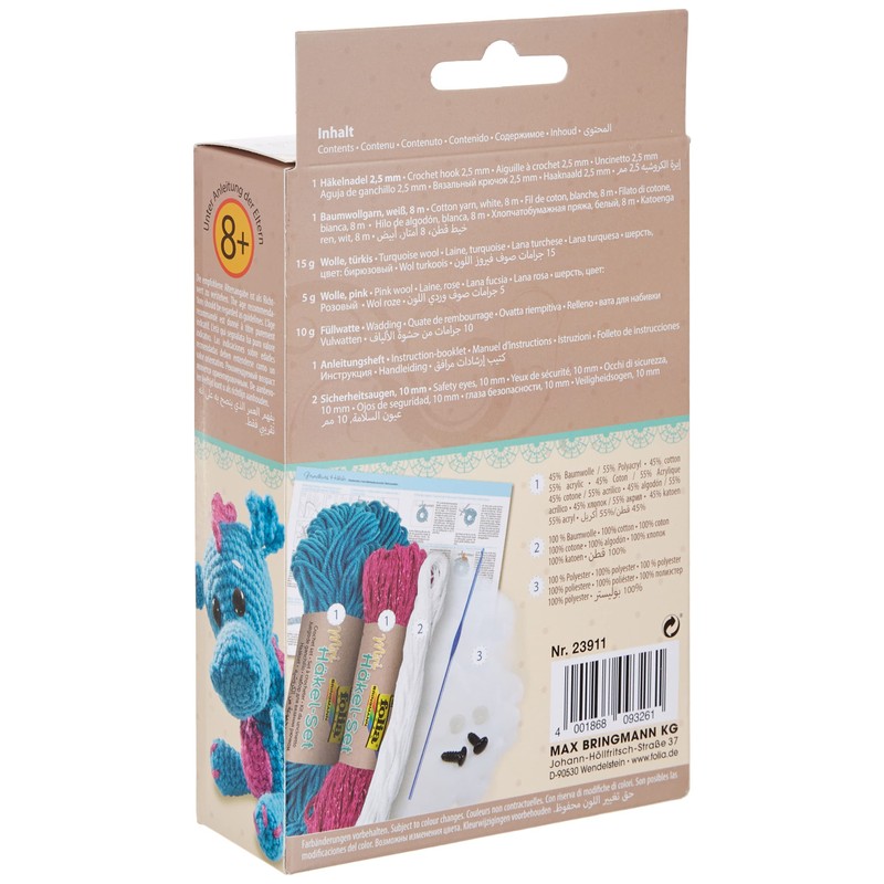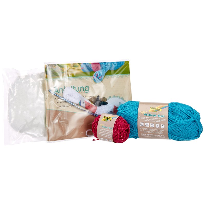 • Contents: 1 crochet hook, 2 eyes, 10 g filling, turquoise and pink wool and white wool yarn