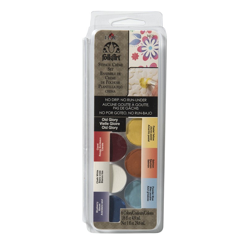 A favorite among home decor stencils, FolkArt dry brush stencil paint sets allow you to stencil without the mess and drips! the self-sealing formula provides a longer open time, allows easier blending and shading, gives the ability to build colors from soft to bold, and helps eliminate run-under! this 6-color old Glory kit contains colors Claret, chalk white, powder blue, blueberry, pastel yellow and Salmon.