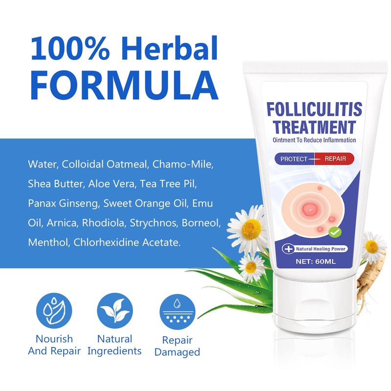 - Natural & Gentle Formula:Made with soothing natural ingredients like tea tree oil, aloe vera, and calendula to effectively treat folliculitis without harsh chemicals or irritation.