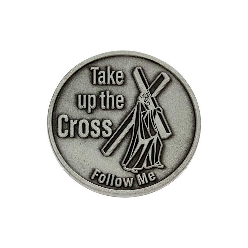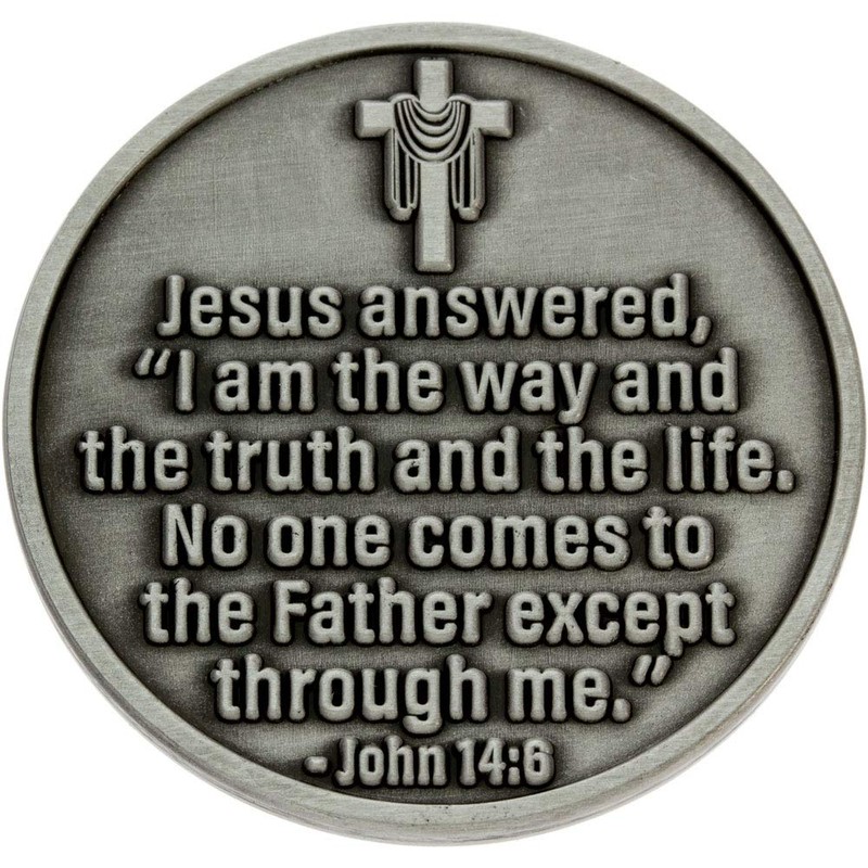 Family pack set of 4 coins tokens. Jesus Carrying Cross in Jerusalem Reminder Biblical quote coin token Take Up the Cross Follow Me Coin Silver, Jesus answered, I am the way and the truth and the life. No one comes to the Father except through me. John 14:6 1 1/4 inch silver pewter coin. Quality Antique Silver finish pewter coins. Christian religious coins. Little reminder gifts to let someone know you're thinking of them and the future. Easter, Lenten coin. Tokens Sold individually