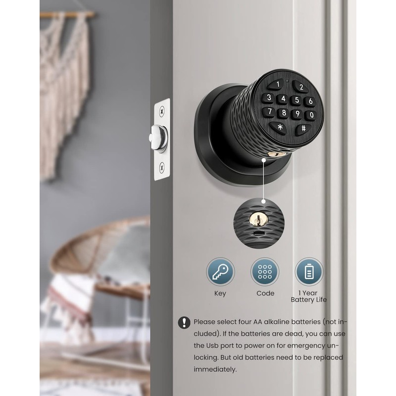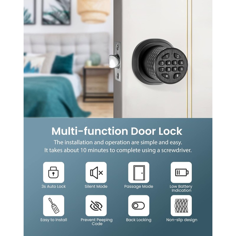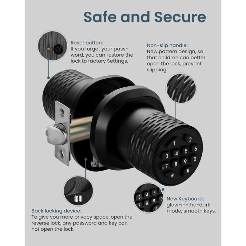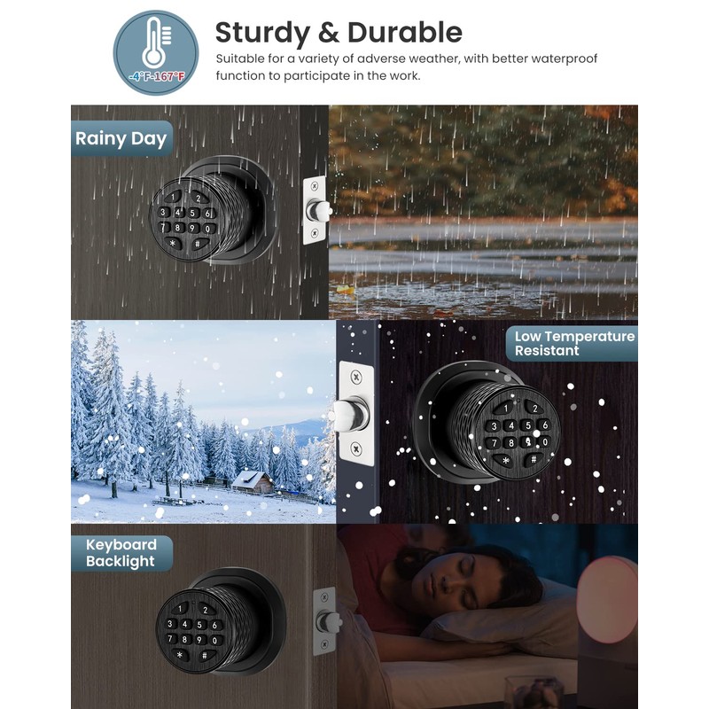 - đăEnhanced Security & Durableă The keypad door knob enter lock is sturdy and durable. With automatic locking retractor, the door will automatically lock behind you after opening for 3 seconds.IP65 weatherproof, works great in any weather.