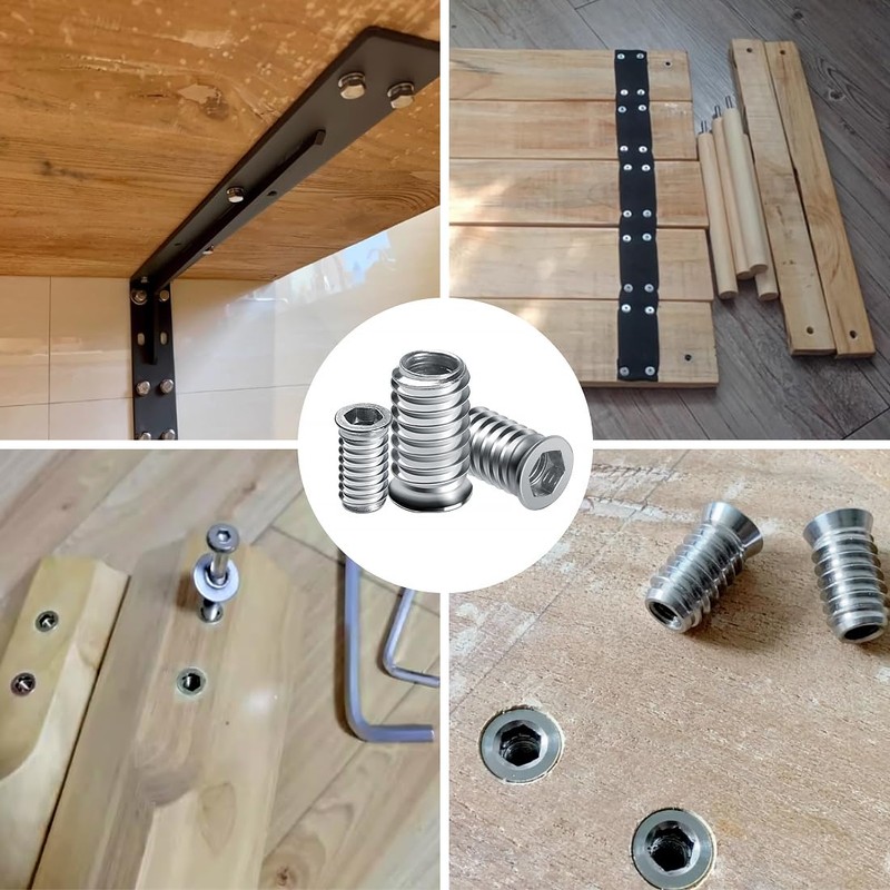 - Design features: Threaded insert wood has exquisite craftsmanship, clear and deep threads, smooth surface without burrs, high hardness, strong practicality and biting power. Thread insert: the unique design of the external thread structure has good tensile strength, thread precision deep which can effectively prevent falling due to torsion or vibration, making the screw connection more stable.