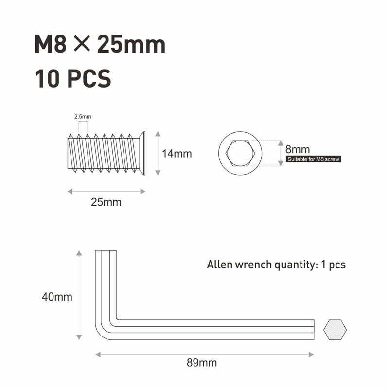 - The set includes: 10 pieces M8 x 25 threaded inserts screw-in sleeves and 1 piece corresponding hex key. Hexagon socket screw nuts is an ideal choice for mounting and fixing furniture.