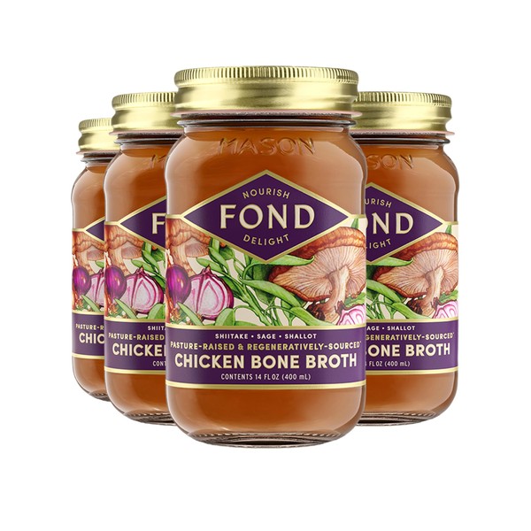 FOND Regenerative Pasture-Raised Chicken Bone Broth Infused with Organic Shiitake & Sage – Slow-Simmered Chicken Broth for Rich and Nourishing Flavor, Nutrient-Dense, Artisan Quality – 14 oz (4-Pack)
