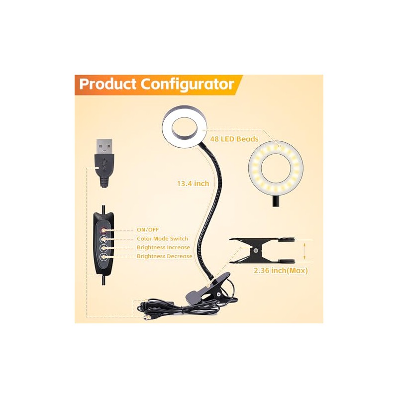 - ??Robuster Clip und 360 verstellbarer schwanenhals360 verstellbares Schwanenhals- und Ringlichtdesign, das Ringdesign ist ideal fr eine bessere W?rmeableitung und eine gr??ere Lichtfl?che. Der robuste Metallclip ?ffnet sich auf 6cm und ist auch sehr tragbar fr die Befestigung an Schreibtisch, Tisch, Garderobe, Kopfteil, Computer und anderen Orten.