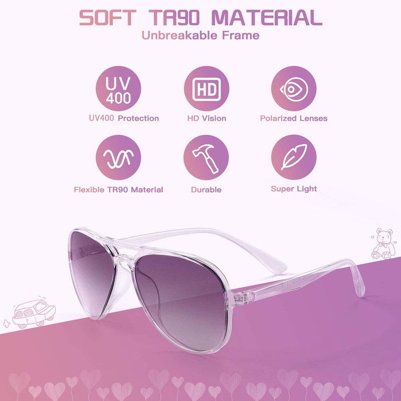 - 【UNBREAKABLE TODDLER SUNGLASSES】The polarized lenses are made of TAC material, which make it impact resistant and durable for the use. No longer worry about the kids aviator sun glasses being damaged by your child. Lightweight and durable TR90 frame and one-piece nose pads put no stress on children's nose ensure comfort to wear for long periods of time. One size can perfectly fit kid’s faces comfortably. Better enjoying a sunny day outside with FONHCOO sunglasses for children!