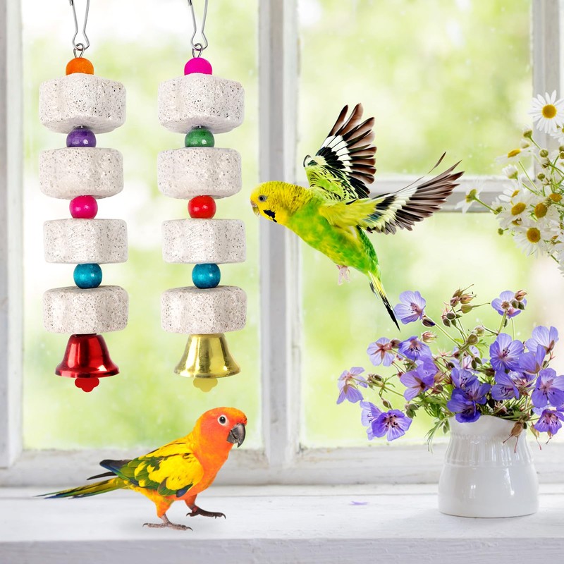 Fonyet Pack of 2 Large Parrot Toy Bird Chew Toy Mineral Stone Molar Tooth Toy with Bell, Limestone for Budgies, Macaws, African Grey Cockatoos, Cockatiels
