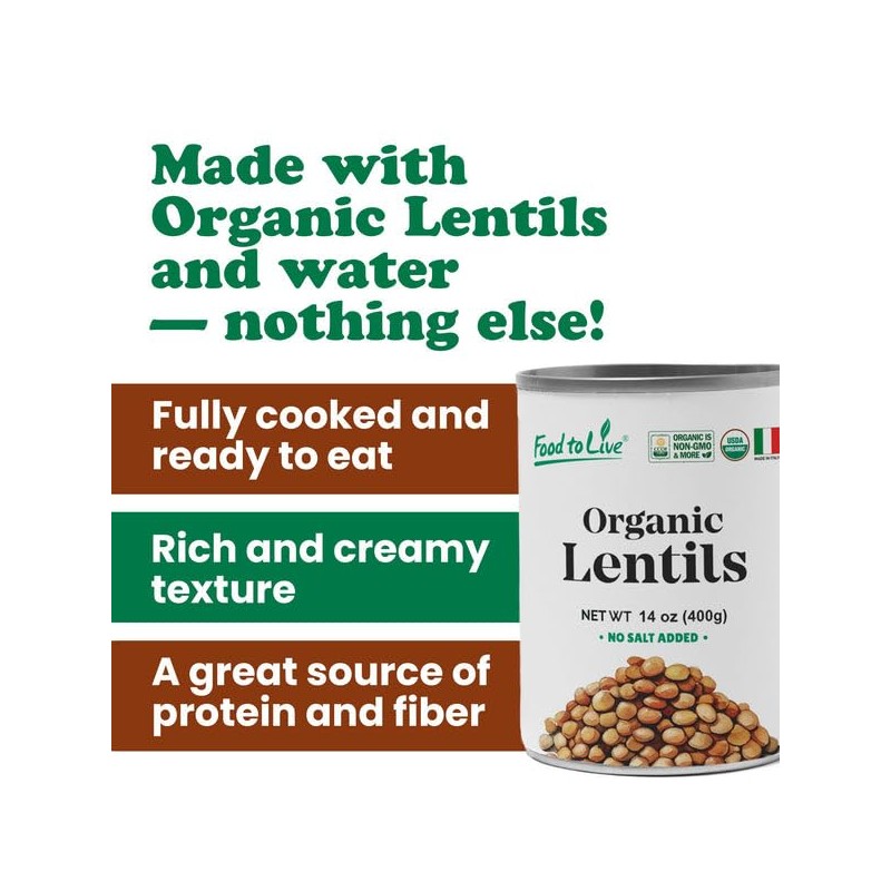 Food to Live Organic Canned Lentils, 14 oz (Pack of 8) – Unsalted, Non-GMO, Vegan. Ready to Eat. Perfect for Salads, Soups and Quick Meals. Wholesale