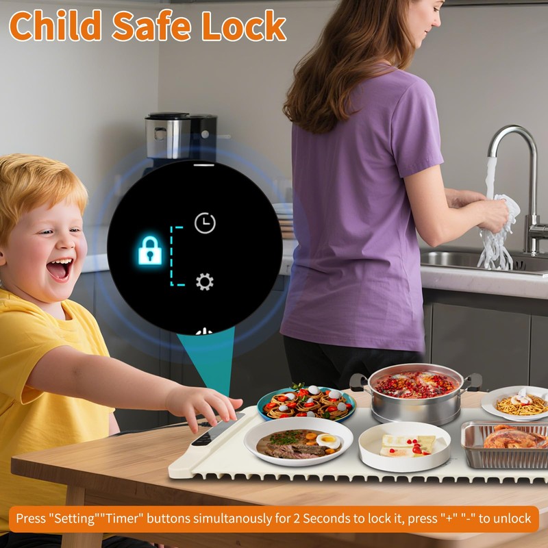 - Child Safety Lock & Heat Dissipation Protection: Our warming tray is equipped with a child safety lock to prevent children from misoperating. Child Safe Lock: press "Setting""Timer" buttons simultanously for 2 Seconds to lock it, press "+" "-" to unlock. In addition, we use 15mm elevated non-slip feet to make it more stable and effectively promote air circulation and heat dissipation to prevent overheating and damage to the desktop